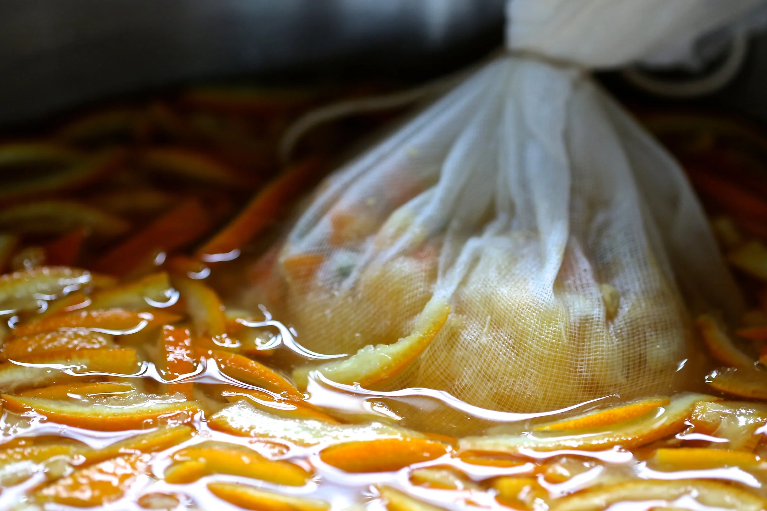 Place the peel, juice, muslin bag and water into a large stainless steel maslin or jam pan.