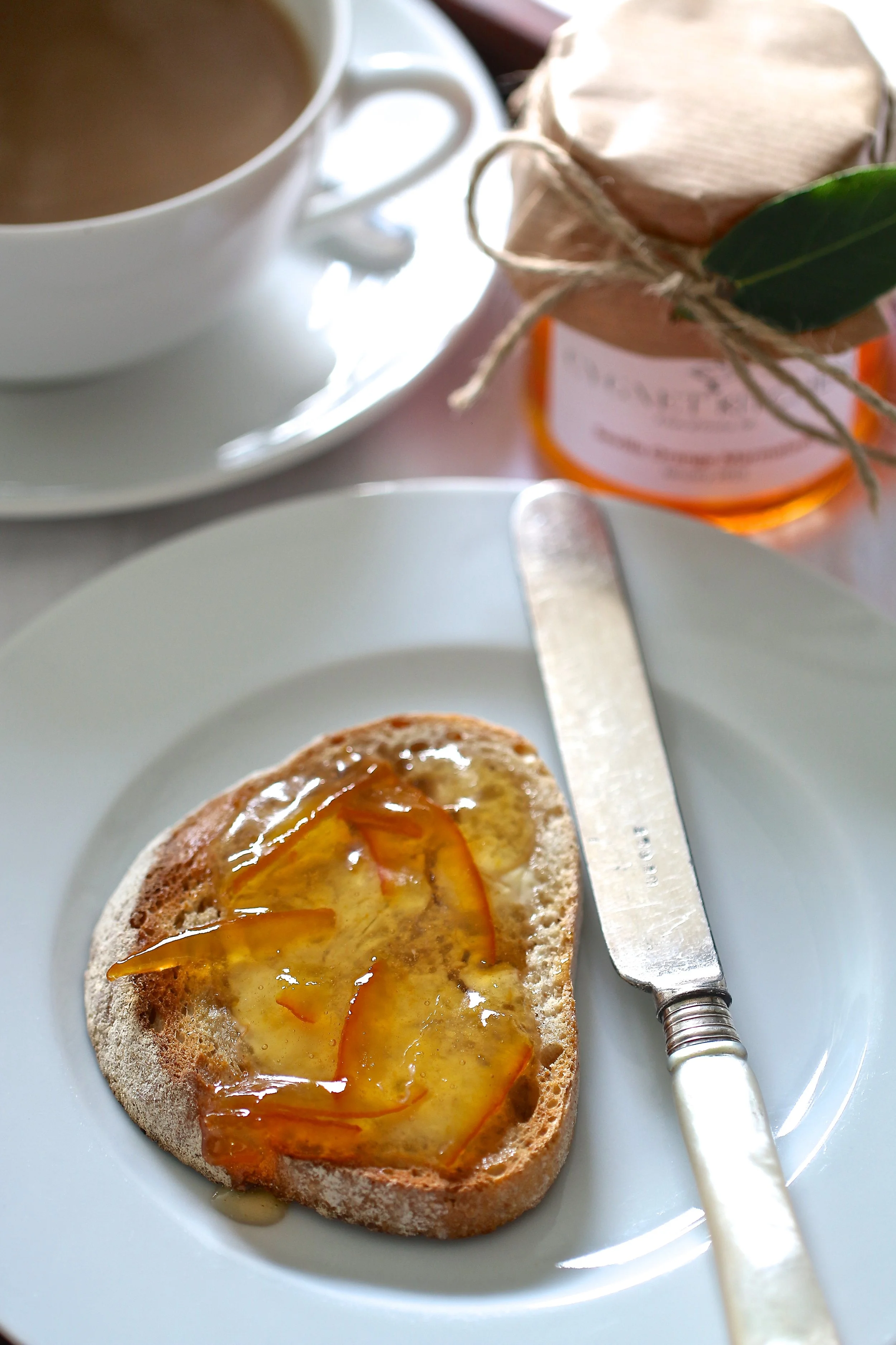 The middle of January brings the first cold snap of the year and a longing to hibernate. I want to stay cocooned in bed, or curl up by a roaring fire and never leave. Everything feels a little flat after the festive period, a sense of stillness, as if waiting for the first signs of Spring. The timely arrival of Seville oranges, in season for a few precious weeks, brings some much need kitchen therapy. I love the ritual of making marmalade, the smell of the oranges bubbling away fills the house with warmth and cheer. It's as if these bittersweet Spanish citrus fruit bring with them the promise of sunshine to come.Every marmalade enthusiast has their own take on the best way to make it. The ingredients are pretty much the same, essentially oranges, sugar, water and lemon juice, but the method can vary considerably. I have tried several different methods and my recipe takes something from each of them, which I find works like a dream. Most marmalade fans have their preference when it comes to peel, whether chunky or fine cut and I definitely fall into the latter camp. Some prefer the dark sticky variety, but I like mine as clear as a bell, with the thinest shards of translucent peel suspended like bright jewels.If you've never made marmalade before, it may seem like a lot of work, but its not at all arduous. It does take some effort to finely slice the peel, but if you are tempted to use a food processor you will undoubtably spoil the end result. I think there is something quite therapeutic and satisfying about slicing it by hand. If you needed any further encouragement to make the most of the Seville orange season, the 25th - 31st January is alsoBritish Breakfast Week . I can't think of a better way to celebrate than with breakfast in bed. A few slices of toasted sourdough , unsalted butter and a pot of freshly made Seville Orange Marmalade. Such a simple yet decadent indulgence, definitely worth coming out of hibernation for.
